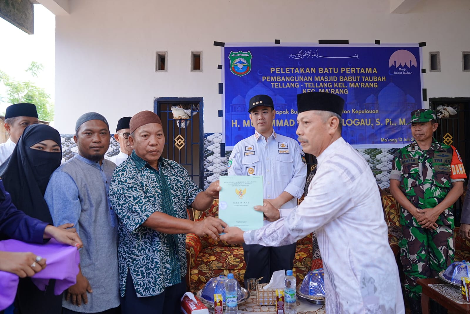 Bupati Pangkep, Muhammad Yusran Lalogau (MYL) melakukan peletakan pertama Peletakan Batu Pertama Pembangunan Masjid Babuttaubah, Kampung Tellang-tellang Kelurahan Ma’rang, Kecamatan Ma’rang